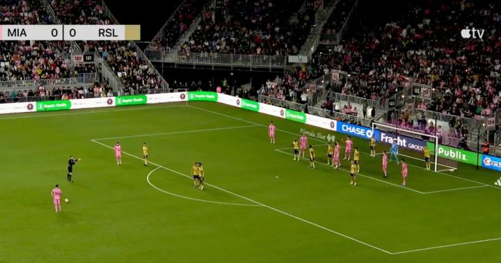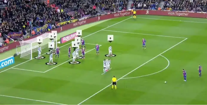(图)梅西一次任意球主罚时,对方全部站位防守