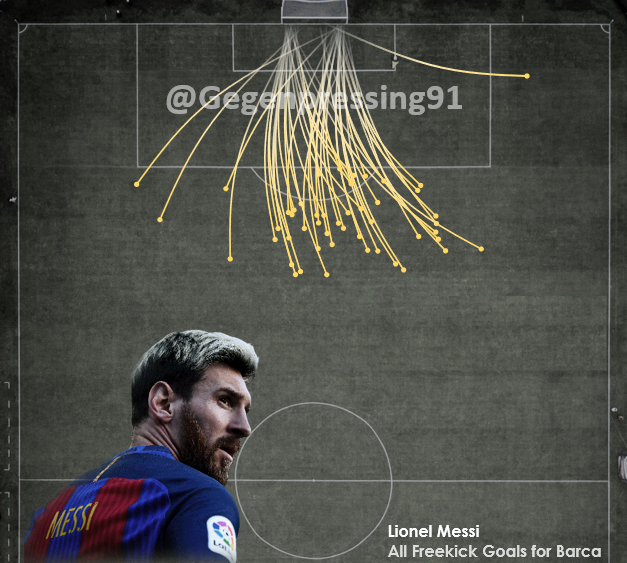梅西在2017/18赛季至2019/20赛季,任意球技术登峰造极,得分数极多,转化率极高。