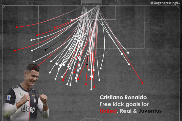 (图)C罗在曼联、皇马、尤文图斯的任意球得分点分布图