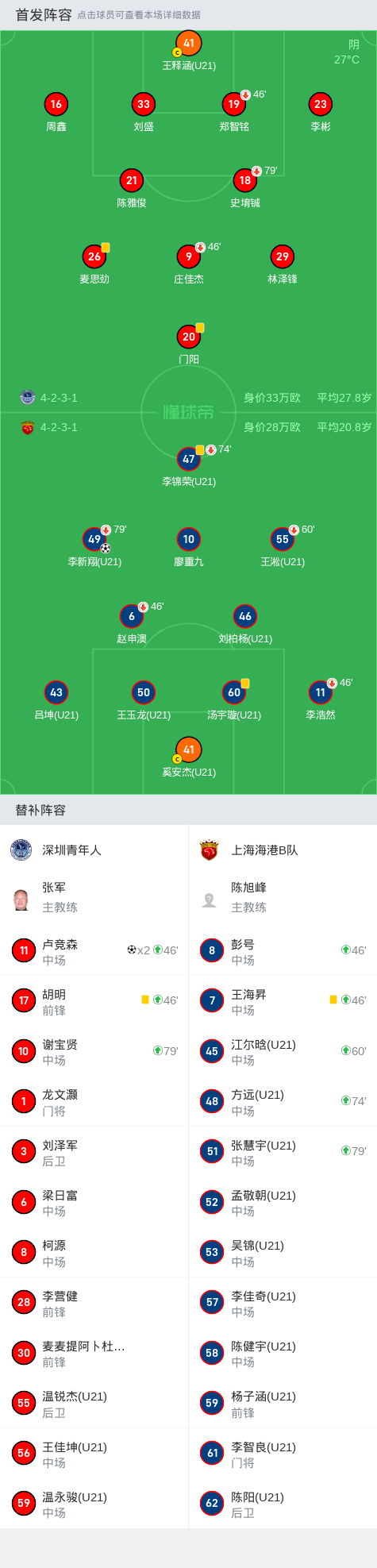 在中国足球乙级联赛预赛阶段第12轮的比赛中,深圳青年人队主场迎战上海海港B队。上海海港B队的李新翔先打破僵局,之后比赛因天气问题长时间暂停,深圳青年人队卢竞森之后连续打进两球逆转比分。最终比分为深圳青年人 2-1 上海海港B队。