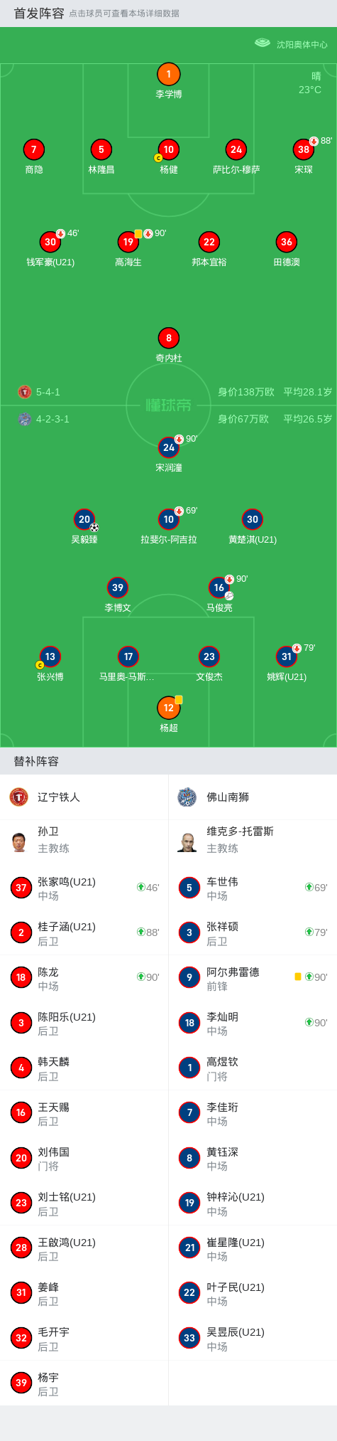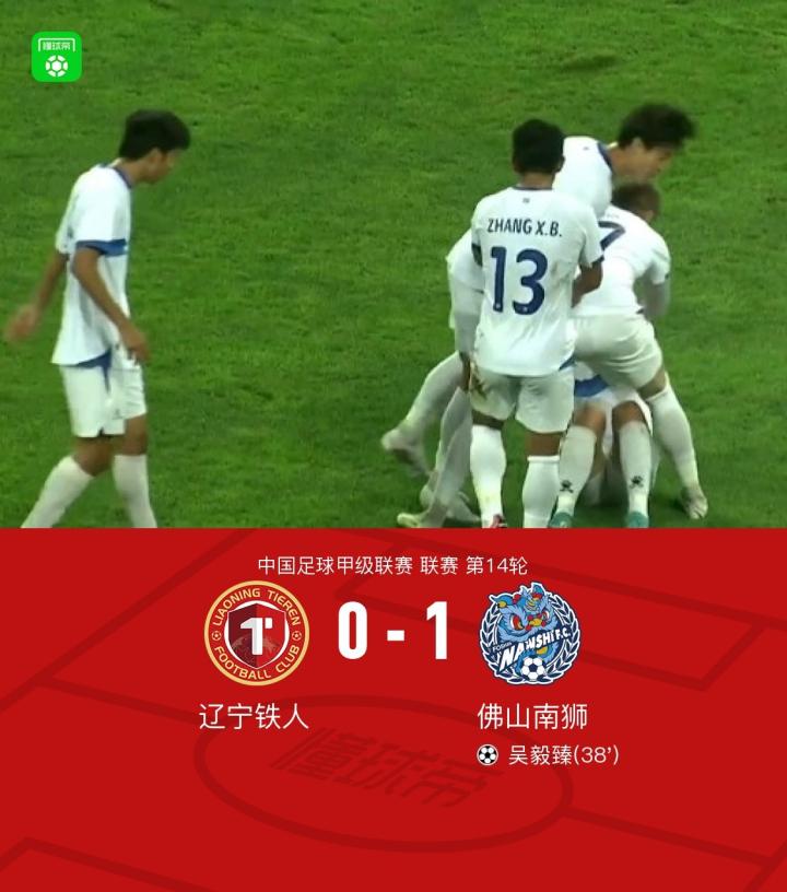 佛山南狮1-0客胜辽宁铁人,吴毅臻打进全场唯一进球