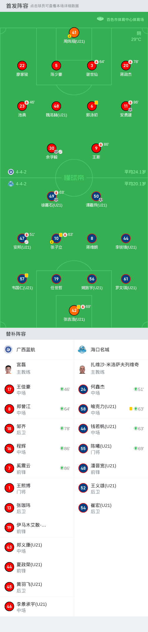 在中国足球乙级联赛预赛阶段第12轮比赛中,广西蓝航与海口名城展开了激烈的对决。安勇建脚后跟过人后首开记录,谭嘉烨禁区打门扳平,徐嘉石撞射反超比分,下半场余学毅扳平比分。最终,双方握手言和,比分定格在2-2。