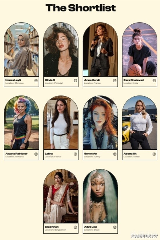 这次入围的AI创作者有Kenza Layli、Olivia C、Anne Kerdi、Zara Shatavari、Aiyana Rainbow、Lalina、Seren Ay、Asena Ilik、Eliza Khan与Ailya Lou等等。全部都是来自世界各地AI网红~