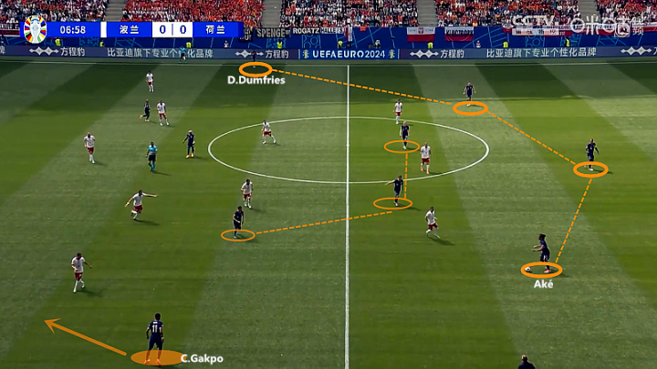 (图)右路带动左路,加克波如果不能进入射程,就会果断选择传中,为远点的邓弗里斯创造机会。反复进行横向拉扯,制造错位进攻机会,荷兰的进攻设计很有针对性。