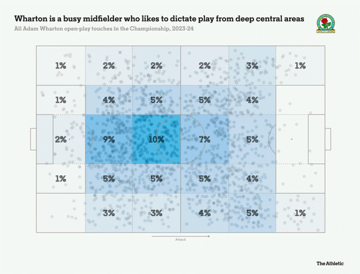 沃顿的踢球风格从他的采访中便可知一二,他在布莱克本时期曾接受采访说到:“比起进球和助攻,我可能更喜欢传渗透球直接找到10号位的球员,让他能轻松转身面对对方防线。”司职后腰的他理解该位置在现代足球中的战术地位,他表示在本方半场深度拿球时一定要保持冷静和勇敢,因为现在更多球队会为了造失误而高位逼抢,而后腰位置正是被逼抢压力最大的。这点我们可以从他在布莱克本的触球比例图看出,沃顿更喜欢在中后场深度接球组织。