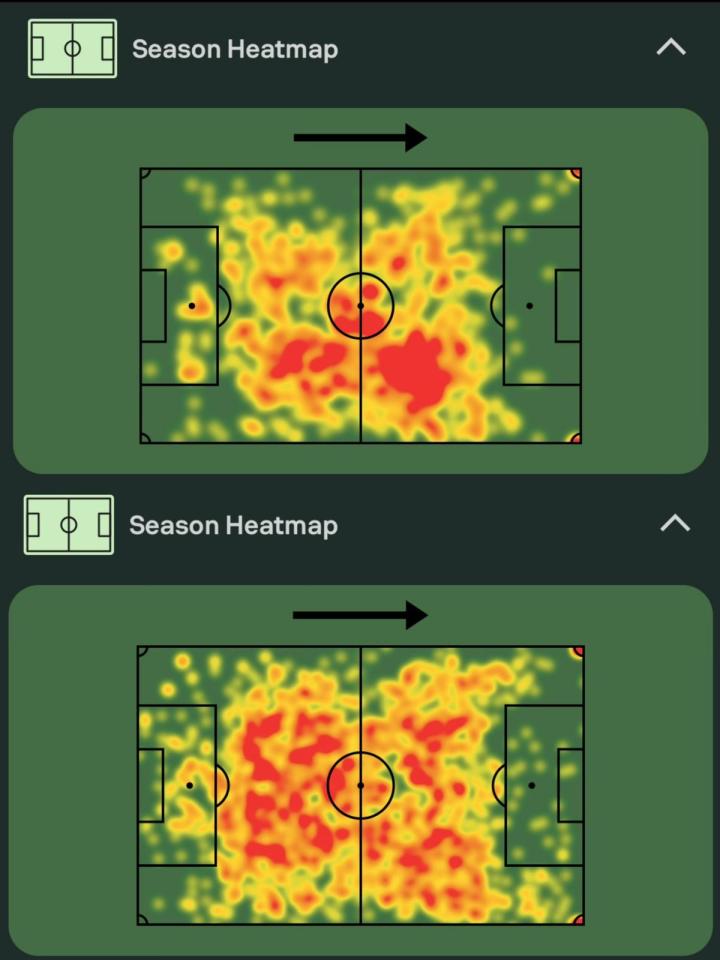 沃顿本赛季的成长离不开格拉斯纳的因材施教,他的体系让沃顿可以尽情施展他梳理进攻的才华。从赛季热图对比中可以看出沃顿在来到水晶宫后的位置有明显的前提和右倾,更多充当8号位的角色,他不需要去在身体对抗更激烈的英超赛场上进行大范围覆盖,大部分脏活被交给了中场搭档休斯。设计如此优良的环境让沃顿可以最大化自己的长处,并持续学习提升。