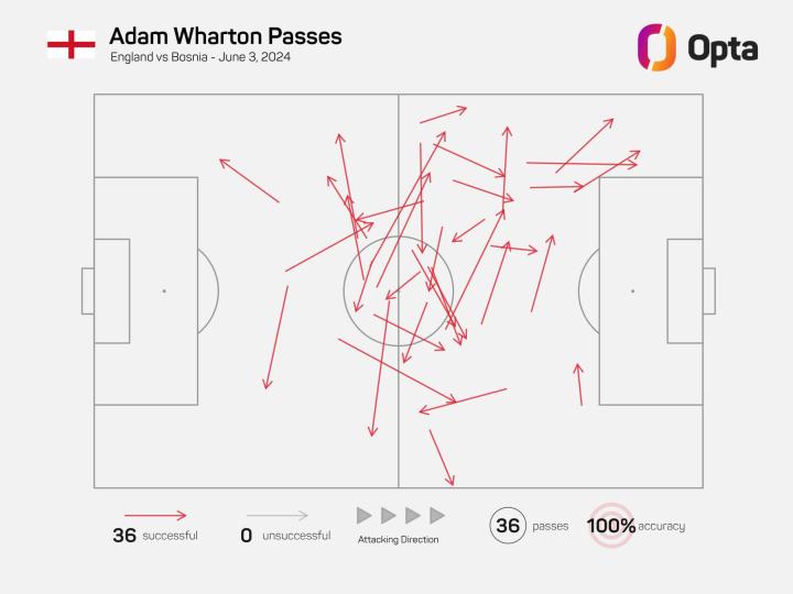 沃顿在28分钟内完成了他所有的36脚传球,无可挑剔的完成了中后场组织和与前场衔接的工作,让人看到他在三狮未来的无限可能。在对阵实力较弱和深度防守球队时他完全有能力踢6号位,这也可以让赖斯得到宝贵的休息机会。对阵中前场逼抢凶狠的强队他可以去到位置稍微靠前的8号位,身后有赖斯搭档来最大化英格兰中场的防守和出球能力。