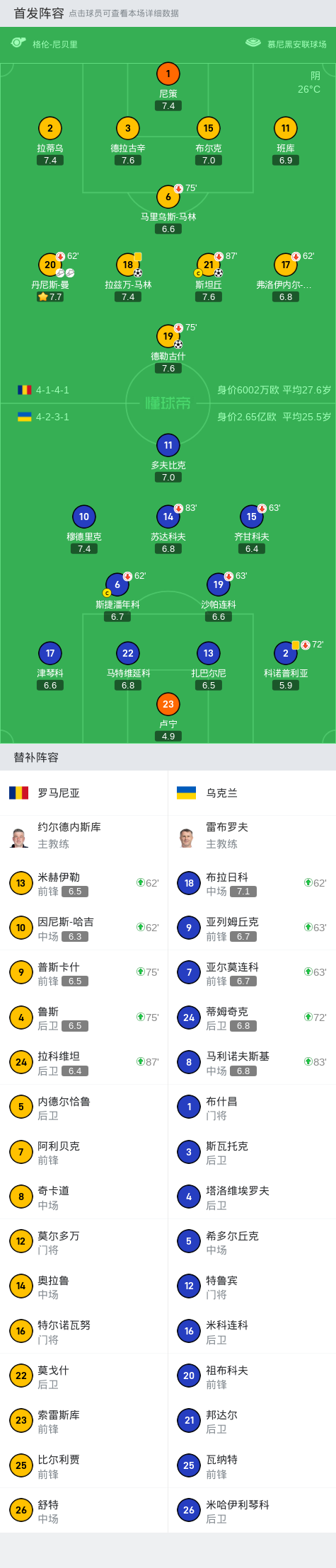 康师傅战报丨罗马尼亚3-0乌克兰,斯坦丘破门+中楣,卢宁失误
