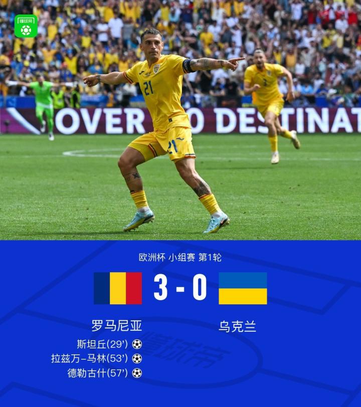 北京时间6月17日21:00,欧洲杯小组赛E组第一轮,罗马尼亚对阵乌克兰,本场比赛场地是慕尼黑安联球场。上半场,卢宁出球失误,斯坦丘世界波破门,随后斯坦丘主罚角球击中横梁;下半场,拉兹万马林、德勒古什先后取得进球。最终罗马尼亚3-0击败乌克兰。