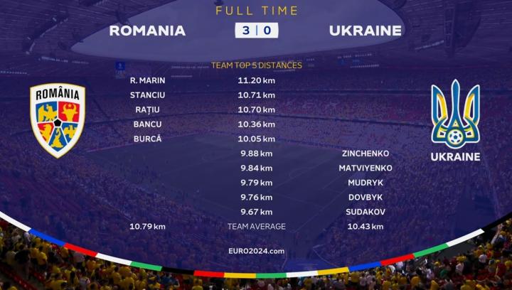 罗马尼亚vs乌克兰跑动距离:前五名均为罗马尼亚球员