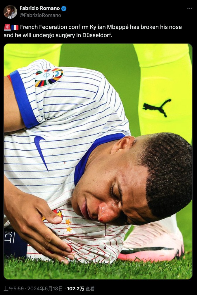 《队报》首席记者坦齐第一时间报道称,姆巴佩鼻子骨折,被救护车送往杜塞尔多夫大学医院,他将在那里接受手术。