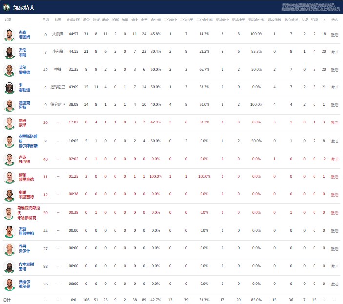 波士顿凯尔特人塔图姆31分8板11助2断,杰伦-布朗21分8板6助2断,霍乐迪15分11板4助1帽;