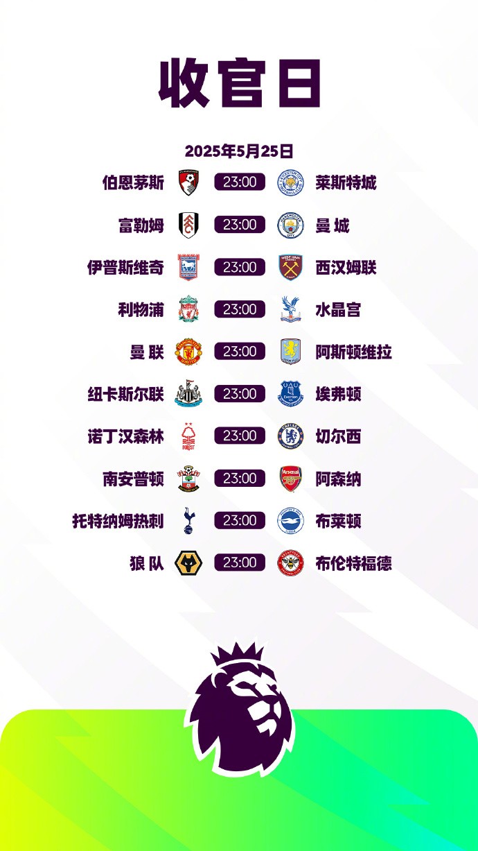 下赛季英超收官战将在5月25日进行,所有比赛同时开球。