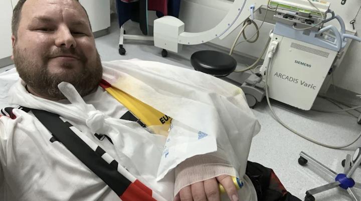 报道称,来自不莱梅的43岁球迷凯-弗拉特曼是德国国家队球迷俱乐部的一员,他获得了一张欧洲杯揭幕战德国队vs苏格兰的门票,他花费了195欧元获得了一个在慕尼黑竞技场球门旁边的前排座位,但他最终只能在医院用手机观看了比赛。