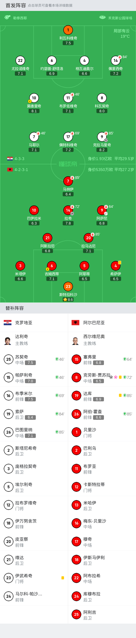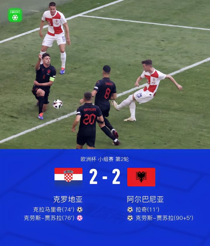 北京时间6月19日晚间21:00,欧洲杯小组赛B组第二轮,克罗地亚对阵阿尔巴尼亚,本场比赛将在禾克斯公园球场进行,主裁判为法国人勒泰西耶。上半场,拉奇头球破门,佩特科维奇头球造险,阿斯拉尼单刀射门被利瓦科维奇神勇扑出。下半场,克拉马里奇低射扳平比分,两分钟后,贾苏拉不慎自摆乌龙,全场补时阶段,贾苏拉扫射完成绝平。最终,克罗地亚2-2阿尔巴尼亚。