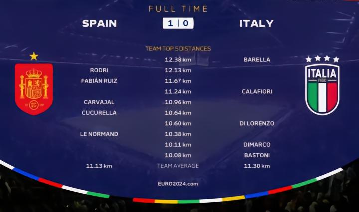 本场比赛跑动距离最多的球员是意大利中场巴雷拉,西班牙中场罗德里和法比安-鲁伊斯则分列第二、三位。