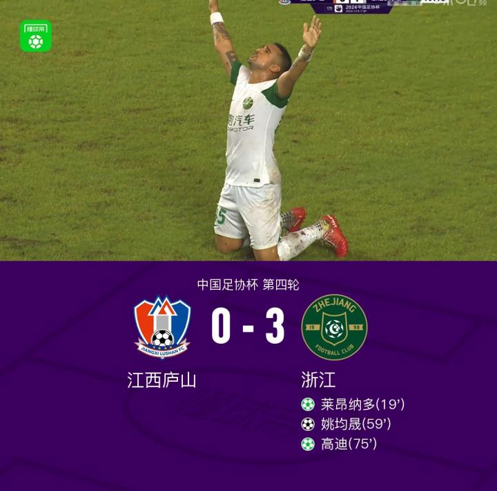 北京时间6月22日,中国足协杯第四轮比赛在江西庐山主场进行,浙江队迎战江西庐山队。比赛中,浙江队的莱昂纳多通过点球首开纪录,随后姚均晟再下一城,接着高迪也通过点球将比分扩大。最终,浙江队以3比0战胜江西庐山队。