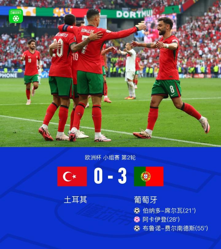 在欧洲杯小组赛第二轮的较量中,土耳其迎战葡萄牙。上半场葡萄牙左路发起攻势,B席后点抽射破门首开记录,随后阿卡伊登回传球不慎打入自家球门,接下来C罗打门造险,莱奥假摔染黄,下半场C罗助攻B费推射空门破门锁定胜局。最终,葡萄牙以3-0战胜土耳其。