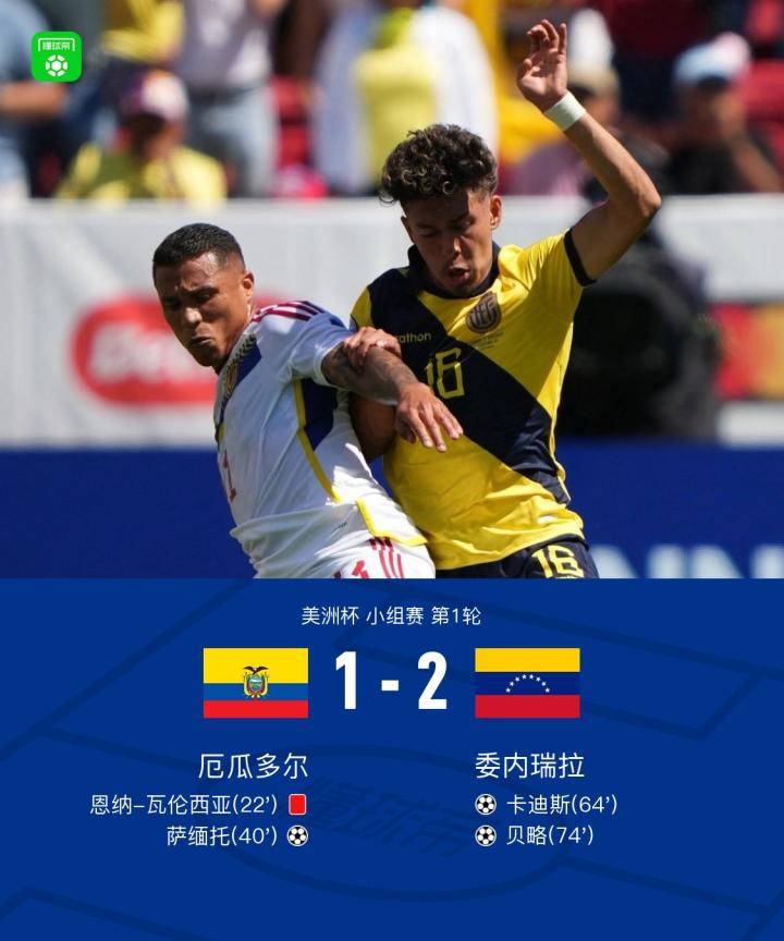 在美洲杯小组赛的首轮比赛中,厄瓜多尔迎战委内瑞拉。上半场,瓦伦西亚因为踹人被主裁直红罚下。随后,萨缅托为十人作战的厄瓜多尔打破僵局。下半场,委内瑞拉替补登场的卡迪斯和贝略相继破门帮助球队反超。全场比赛结束,委内瑞拉2-1逆转击败十人厄瓜多尔。