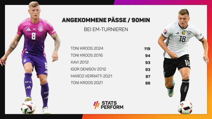 根据统计,现年34岁的托尼-克罗斯本届欧洲杯小组赛前两轮平均每90分钟能够为队友送出119脚传球,在欧洲杯历史上所有出场至少150分钟的中场球员里,这样的数据排名第一。