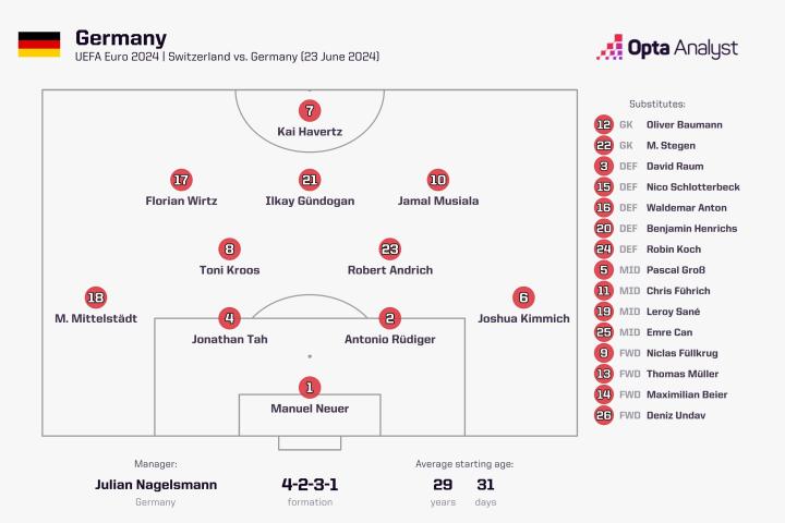 取得开局两连胜的德国队已经提前出线,但他们仍需为小组头名而战,此役对阵瑞士,纳格尔斯曼又一次没有调整首发阵容。据统计,这是德国队史首次在欧洲杯连续三场比赛排出相同的首发11人。