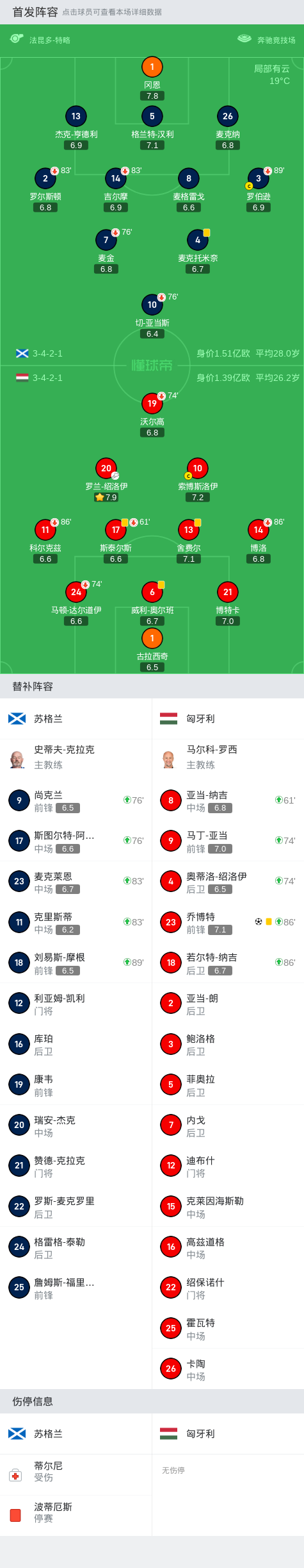 在欧洲杯小组赛第3轮的较量中,苏格兰迎战匈牙利。上半场,博洛远射被扑,罗兰-绍洛伊抽射打偏,奥尔班头球中框。下半场,沃尔高和冈恩相撞倒地后昏迷,比赛长时间中断,比赛最后时刻,舍费尔、索博斯洛伊连续打门被扑,乔波特抽射击中立柱后读秒绝杀,最终,匈牙利1-0绝杀苏格兰升至小组第三保留晋级希望,苏格兰小组垫底出局。