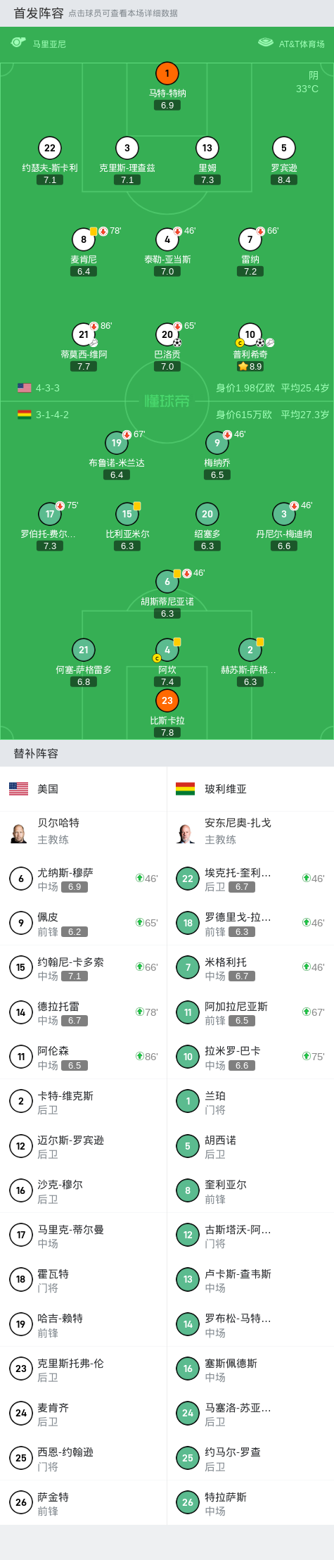 美洲杯美国2-0玻利维亚迎开门红,普利希奇传射,巴洛贡建功