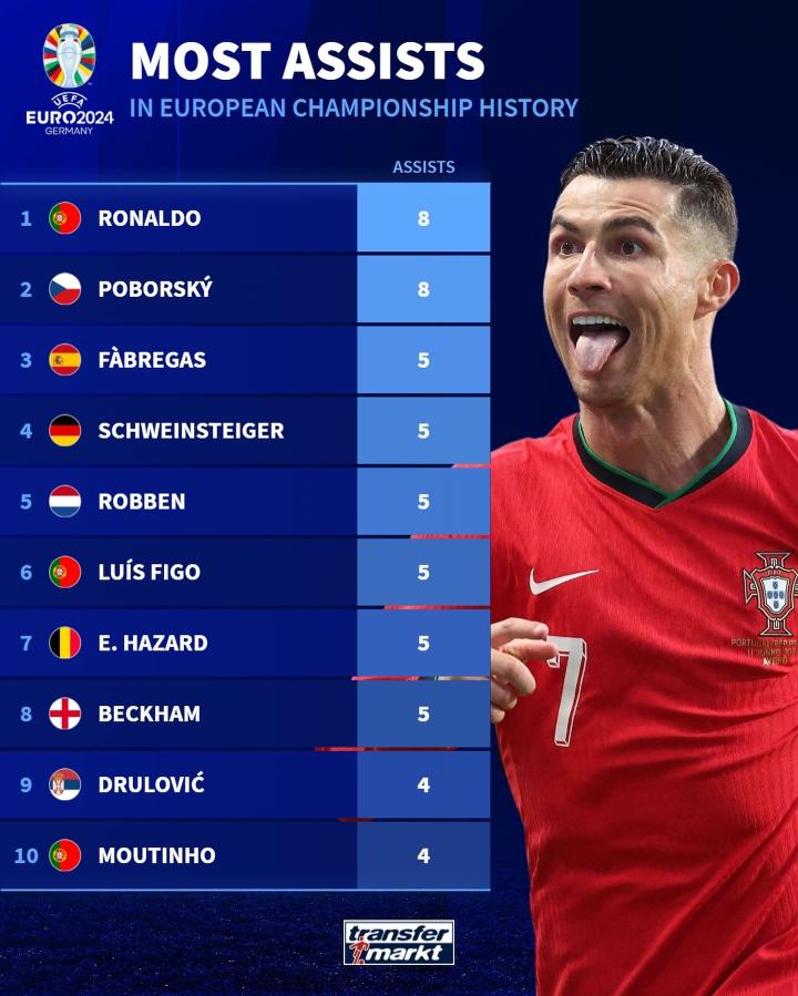 德转列欧洲杯历史助攻榜:C罗8次占头名,波博斯基并列第一