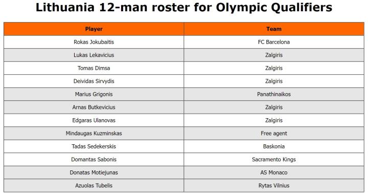 立陶宛男篮奥运资格赛名单: