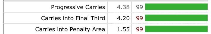 从FBref上基于持球的数据观察,只能进一步证明他颇具特点。