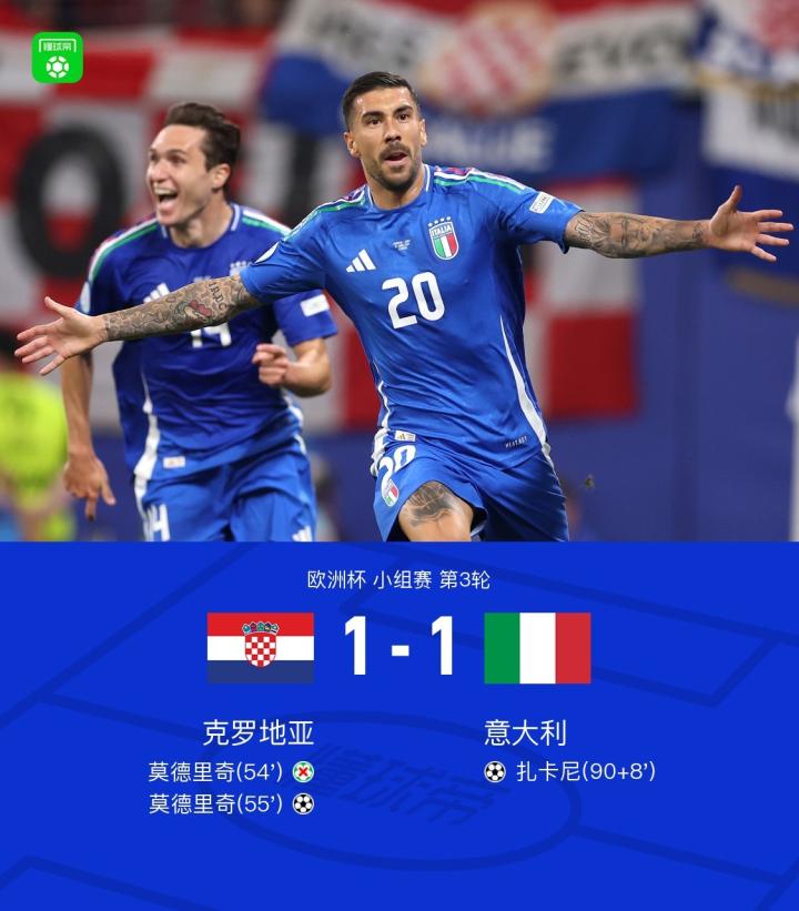 第90+8分钟,极限绝平!!!扎卡尼推射破门,意大利1-1克罗地亚升至小组第二