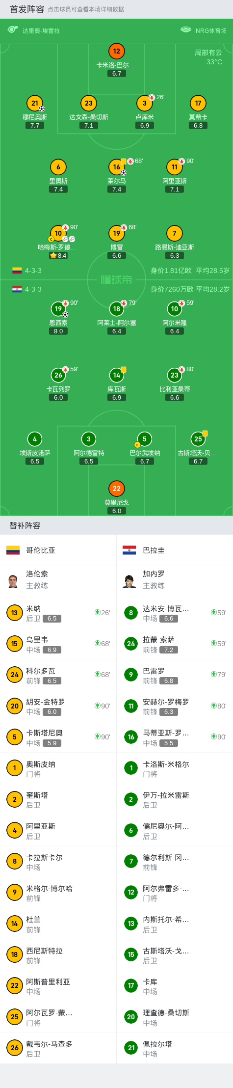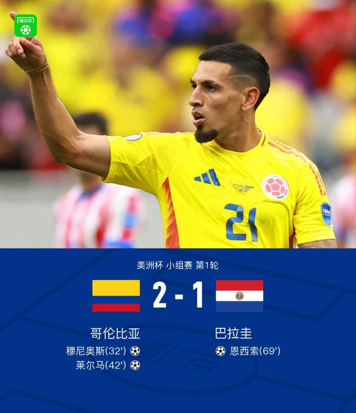美洲杯哥伦比亚2-1巴拉圭,J罗两助攻,莱尔马、穆尼奥斯头槌