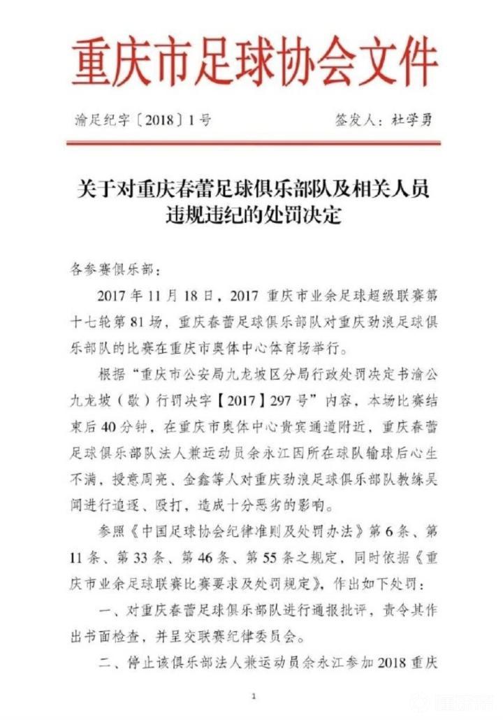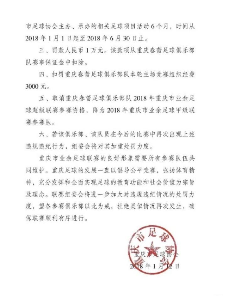 以下是此前重庆足协下发的处罚决定