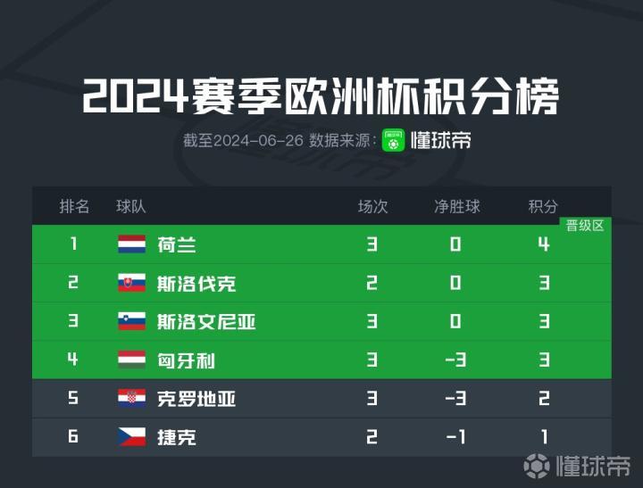 随着斯洛文尼亚与荷兰锁定成绩最好的四个小组第三,克罗地亚积2分无缘出线。现在,欧洲杯小组赛第三名的出线情况只剩三种。