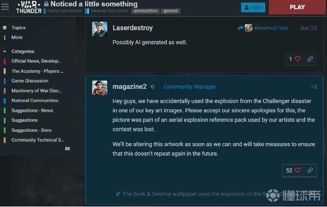 《战争雷霆》开发商Gaijin Entertainment就近日的新艺术图误用1986年挑战者号航天飞机空难素材官方为此道歉。
