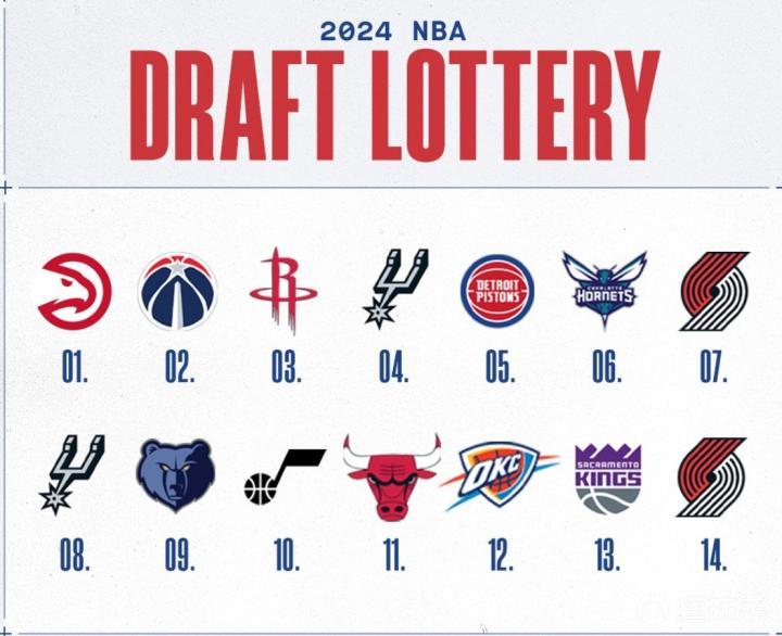 老鹰手握状元签,奇才火箭分居二三,马刺拥有4+8两个乐透签,活塞黄蜂分列五六,开拓者手握7+14两个乐透签。