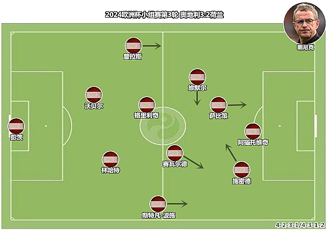(图)第三轮面对荷兰,朗尼克大胆轮换,丹索、鲍姆加特纳和莱默尔都坐在了替补席上。奥地利的4231可以向4312切换,施密德和维默尔内收,格里利奇可以在中场自由移动,萨比策来到锋线配合阿瑙托维奇作战。