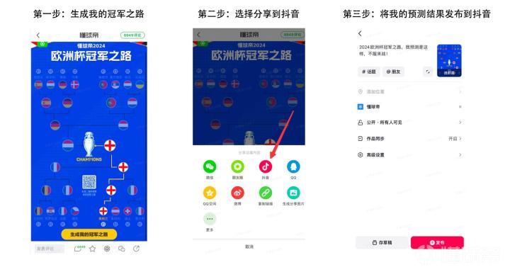 2、将我的预测结果分享到抖音#懂球帝欧洲杯冠军之路#,即可参与抽奖