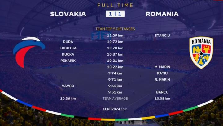 本场比赛跑动距离最多的球员是罗马尼亚队长斯坦丘,第二至第五位则全部都是斯洛伐克球员。