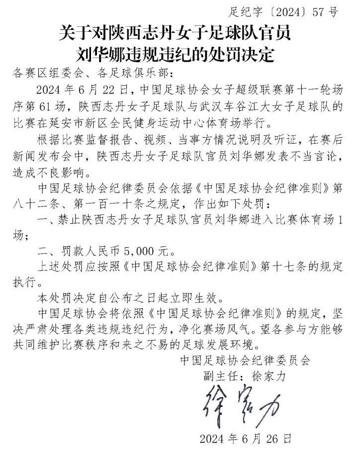 足协官方:对陕西志丹女足官员刘华娜禁赛1场,罚款5000元
