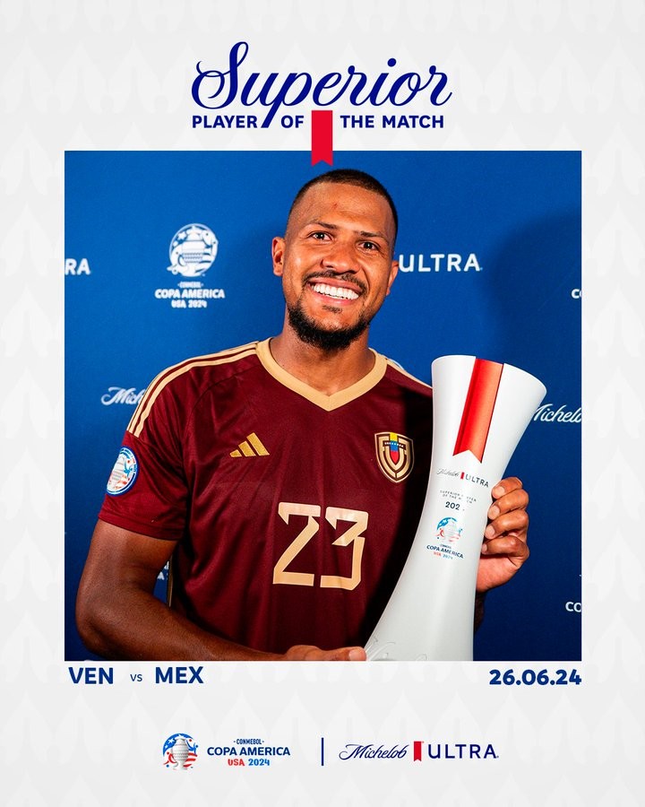 北京时间6月27日,美洲杯B组第二轮展开较量,委内瑞拉1-0战胜墨西哥提前出线,本场比赛点射制胜的委内瑞拉前锋龙东当选比赛最佳球员。这是龙东连续两轮当选美洲杯单场最佳球员,此前对阵厄瓜多尔的比赛中龙东独造两球,赛后被评为比赛最佳球员。
