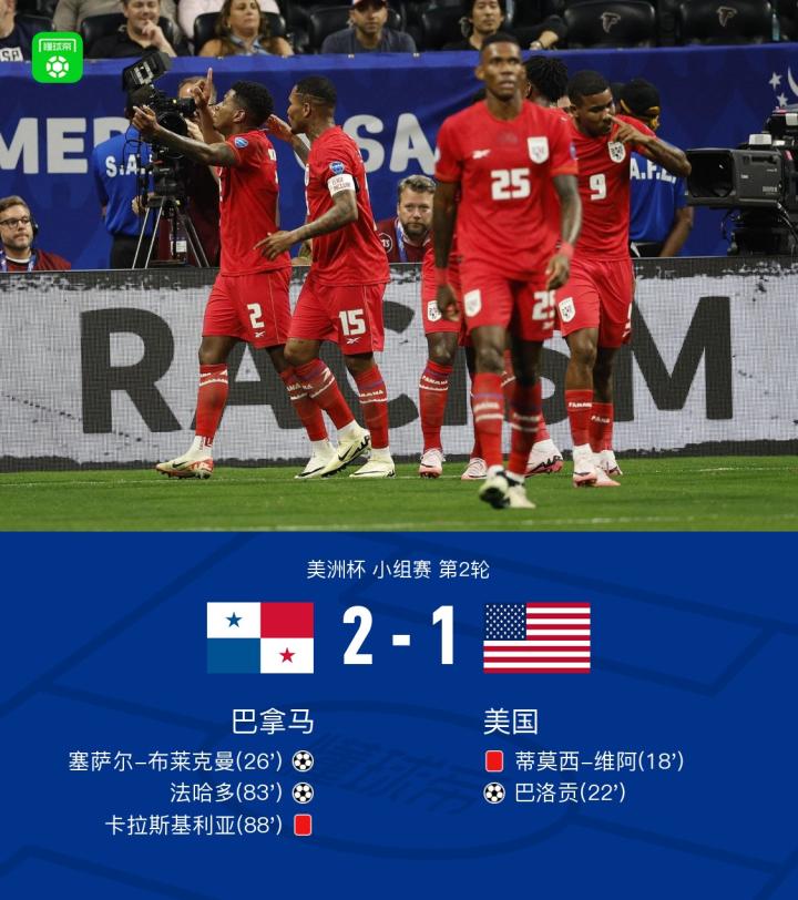 在北京时间6月28日进行的美洲杯小组赛第2轮比赛中,巴拿马队迎战美国队。上半场,麦肯尼进球被吹,蒂莫西-维阿击打对手被红牌罚下,巴洛贡打破僵局,布莱克曼扳平比分。下半场,法哈多抽射破门,卡拉斯基利亚踢倒普利希奇被红牌罚下,最终,巴拿马2-1美国。