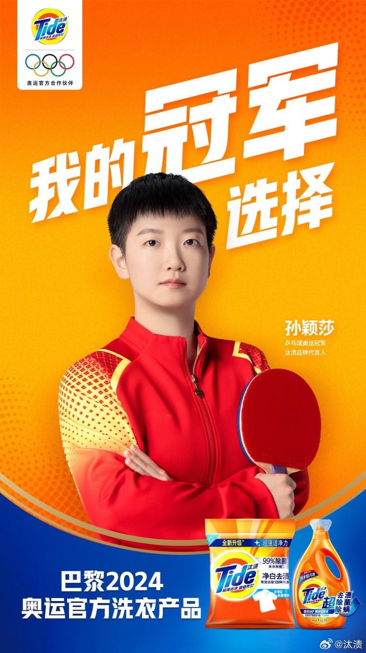 6月26日,宝洁旗下品牌汰渍官方宣布,奥运冠军、即将出战巴黎奥运的孙颖莎出任品牌代言人。