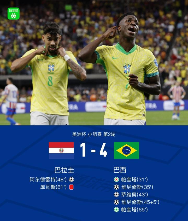 北京时间6月29日09:00,2024美洲杯小组赛D组第2轮,巴西与巴拉圭在拉斯维加斯Allegiant体育场展开角逐。上半场,帕奎塔失点,随后巴拉圭后防连续送礼,维尼修斯上演梅开二度,萨维奥建功。下半场,阿尔德雷特远射为巴拉圭扳回一城,帕奎塔点射,库瓦斯被直红罚下。最终,巴西4-1完胜巴拉圭,仍居小组第二。