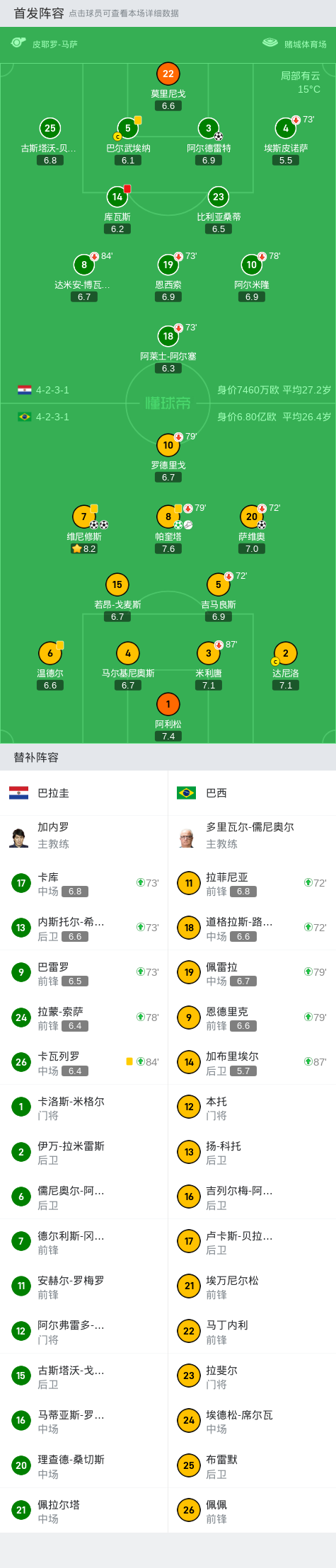 第79分钟,恩德里克、佩雷拉替补登场,罗德里戈、帕奎塔被换下