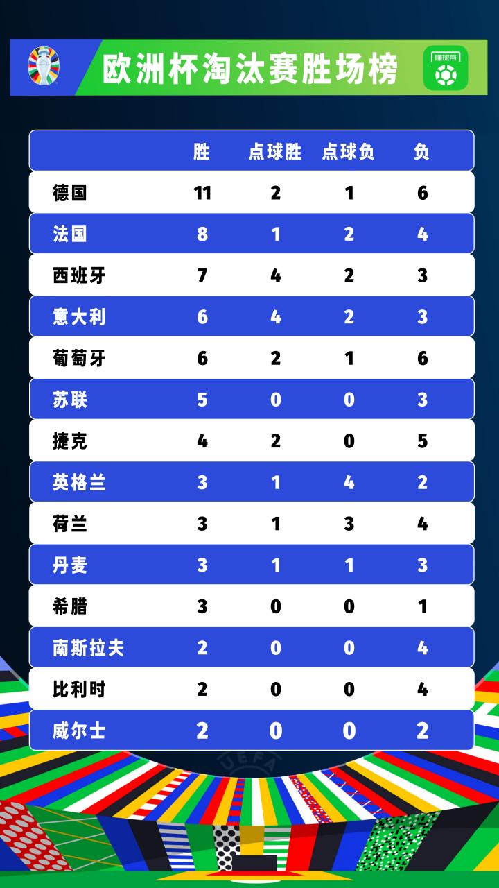 在欧洲杯淘汰赛历史上,德国队以11胜领跑,法国、西班牙、意大利、葡萄牙位居2-5位。