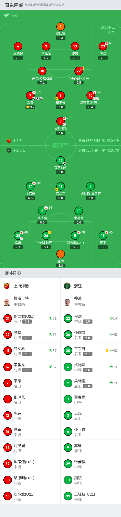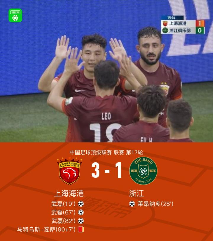 北京时间6月29日中超联赛第17轮,上海海港主场对阵浙江。武磊在比赛第19分钟、第67分钟与第82分钟先后进球完成帽子戏法,莱昂纳多为浙江队打进一球,补时阶段茹萨两黄变一红被罚下。最终比分上海海港3-1浙江。