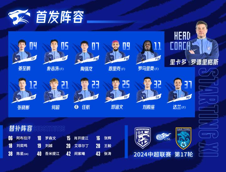 4-姜至鹏、5-朴志洙、7-陶强龙、9-恩里克、11-罗马里奥(90+′ 19-刘越)、12-张晓彬、21-何超[26′ 20-艾菲尔丁(90+′ 42-闵紫曦)]、23-任航、25-邓涵文(46′ 43-张涛)、32-刘殿座、37-达兰