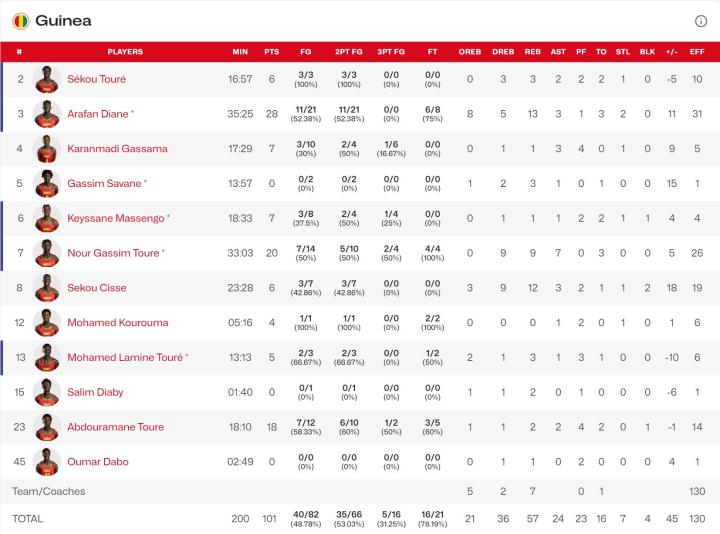 几内亚队同样有三人得分上双,中锋Arafan Diane砍下28分13篮板。