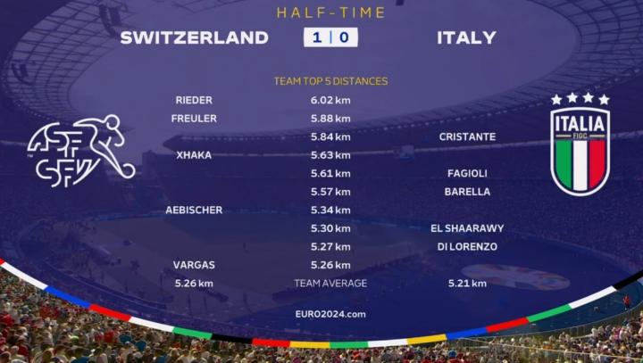 上半场跑动距离最多的两名球员都来自瑞士,分别是法比安-里德和进球的弗罗伊勒,意大利跑动距离最多的球员则是克里斯坦特。